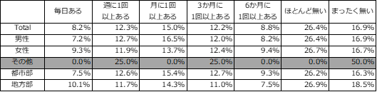 また、「まったく無い」と回答した人は、生活の満足度が「高い」と回答した人で3.8%に留まったのに対し、「低い」と回答した人では18.8%にのぼった。(別紙Q8-1)