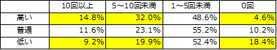 ■「仕事の満足度・充実度」(Q1)と「『ありがとう』や『感謝の気持ち』を1日に何回伝えているか」(Q7)の関係を調べてみると、「仕事の満足度・充実度」が「高い」と回答した人は、「1日に5回以上」の回答が46.8%であるのに対し、満足度が「低い」と回答した人では29.1%と、大きな差がみられた。また、「0回」と回答した割合は、満足度が「高い」と回答した人で4.6%に留まったのに対し、満足度が「低い」と回答した人では18.4%と、大きな差がみられた。