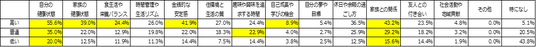 また、「低い」と回答した人と「普通」と回答した人を比べると「趣味や興味を追求する時間」の数値が大きく異なり、「普通」と回答した人と「高い」と回答した人を比べると「家族の健康状態」「金銭的な安定感」「食生活や栄養バランス」「自己成長や学びの機会」の数値が大きく異なった。(別紙Q6-2)