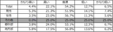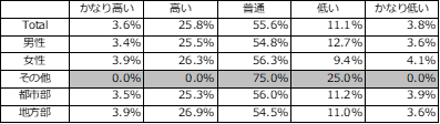 ■現在の生活における満足度・充実度を調査したところ、「かなり高い」「高い」の合計は29.4%、「普通」が55.6%、「低い」「かなり低い」の合計は14.9%だった。性別および地域別の数値に顕著な差はみられなかった。