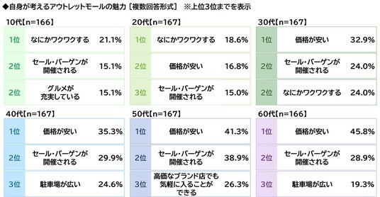 アウトレットの魅力TOP3は「価格が安い」「セール・バーゲンが開催される」「なにかワクワクする」。リーズナブルさが注目されるアウトレットですが、ワクワク感も魅力と捉えられているようです。