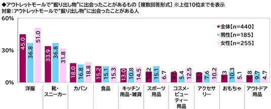 アウトレットモールで“掘り出し物”に出会ったことがある人(440名)に、アウトレットモールで“掘り出し物”に出会ったことがあるものを聞いたところ、「洋服」(45.0%)が最も高くなり、「靴・スニーカー」(33.9%)、「カバン」(18.0%)、「食品」(15.2%)、「キッチン用品・雑貨」(13.0%)が続きました。