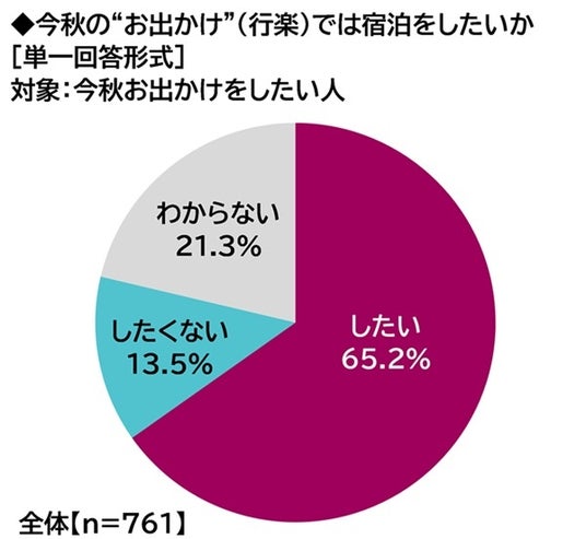 今秋お出かけをしたい人(761名)に、今秋の“お出かけ”(行楽)では宿泊をしたいか聞いたところ、「したい」は65.2%、「したくない」は13.5%と、“宿泊派”が多い結果となりました。