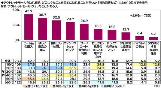 アウトレットモールに行ったことがある人(733名)に、アウトレットモールを訪れる際、どのようなことを目的に訪れることが多いか聞いたところ、「セール品の購入」(42.7%)が最も高くなりました。初売りや夏、冬のセールといった時期を狙って、アウトレットモールに行くという人が多いようです。次いで高くなったのは、「欲しい商品の購入」(36.7%)、「掘り出し物探し」(32.5%)、「ウィンドウショッピング」(29.7%)、「フードコート・飲食店の利用」(26.9%)でした。