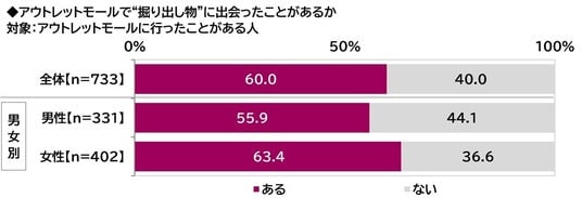 アウトレットモールに行ったことがある人(733名)に、アウトレットモールで“掘り出し物”に出会ったことがあるか聞いたところ、「ある」は60.0%、「ない」は40.0%でした。アウトレットモールで、予想外の逸品やお得な商品と出会い、良い買い物ができたという人は多いようです。