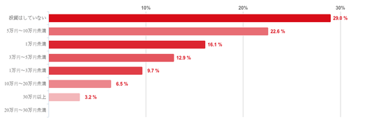 「投資はしていない」が29.0%で最も多く、次いで「5万円~10万円未満」(22.6%)、「1万円未満」(16.1%)と続いた。