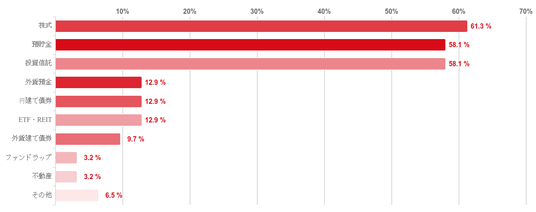 「株式」が61.3%で最も多く、「預貯金」と「投資信託」が58.1%と同率で続いた。