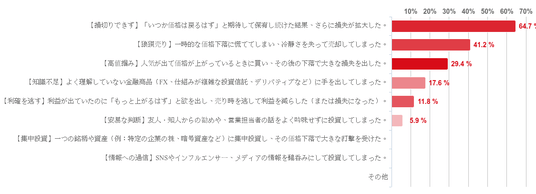 また、「【狼狽売り】一時的な価格下落に慌ててしまい、冷静さを失って売却した」(41.2%)や「【高値掴み】人気が出て価格が上がっているときに買い、その後の下落で大きな損失を出した」(29.4%)という回答も多かった。
