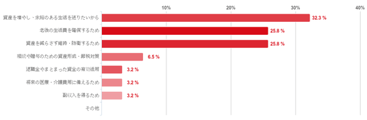 「資産を増やし、余裕のある生活を送りたいから」が32.3%で最も多かったが、「老後の生活費を確保するため」「資産を減らさず維持・防衛するため」も同率で25.8%となり、多くの回答を集めた。