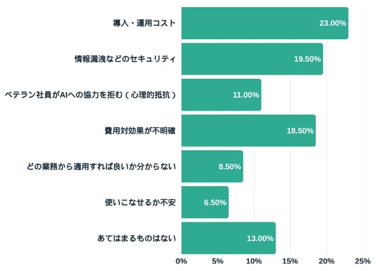 - AIスキル継承システムの導入における最大のハードルは「導入・運用コスト」(23.0%)。- 「情報漏洩などのセキュリティ」(19.5%)「費用対効果が不明確」(18.5%)が僅差で続き、この3つが主要な懸念事項であることが判明。