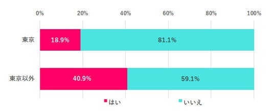 現住所が東京か東京以外かで見てみると、東京在住の人は「はい」18.9%、「いいえ」81.1%と、実家で暮らしている人は少数派でした。一方で東京以外に在住の人は「はい」40.9%、「いいえ」59.1%と、東京在住の人と比べると実家暮らしの人が2倍近くになっていることがわかります。
