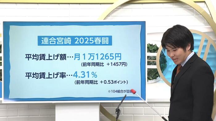 連合宮崎の調査によると、2025年3月から8月末までの104組合の平均賃上げ額は月1万1265円、平均賃上げ率は4.31%となり、初めて月1万円を突破した。しかし全国平均を見ると平均賃上げ率は5.25%で、宮崎は全国平均を0.94ポイント下回っているのが現状だ。