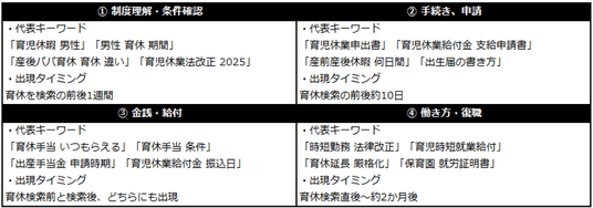 さらに、検索キーワードを検索意図別に整理したところ、関心は大きく4つのテーマに分類できました。育休の取得が促進される中で、情報を調べている様子が浮かびます。