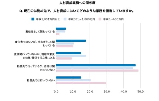 人材育成業務への関与は年収が高いほど積極的で、特に年収1,001万円以上の層は担当者や責任者として深く関わっています。年収0~600万円の層は関与が少ない傾向にありますが、中堅層にも育成業務を分担させる仕組みを設けることで、育成の負荷を分散しながら後進の成長を支援することが可能です。