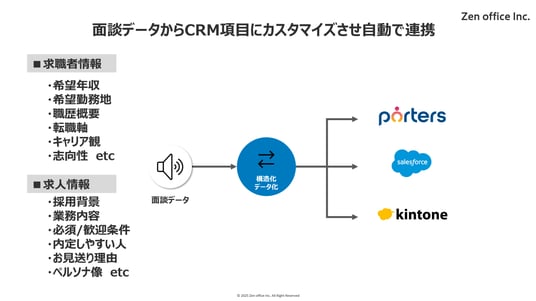 Zen office株式会社(本社:大阪市中央区、代表取締役:岩瀬 恭裕)は、人材紹介特化の音声×AIエージェント「MENDAN」に、新機能「音声→CRM自動連携」機能をリリースいたしました。面談の音声から、求職者・求人の基本的な情報だけでなく「志向性」「転職軸」「キャリア観」、採用企業側の「内定通過率」「お見送り理由」「ターゲットペルソナ」といった“会話からしか得られない情報”まで抽出。面談終了後、数分でCRMに自動反映します。