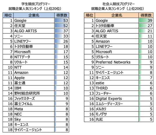 学生・社会人ともにGoogleがトップ。昨年と同様、高い報酬、成長できる環境、優秀な先輩エンジニアがいる環境を選ぶ傾向が明らかに。