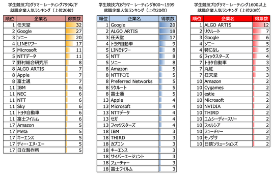 ※「1.就職企業人気ランキング」は、「AtCoder」を除いた得票数2以上の企業を記載しています。