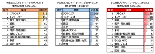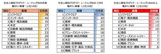 学生・社会人ともに、去年に続き「ソフトウェア」「インターネット」「電子・電気機器」が上位3位にランクインしています。