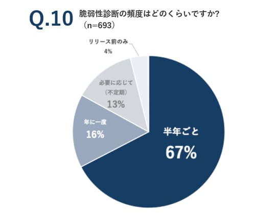 脆弱性診断の実施頻度については、『半年ごと(67%)』という回答が最も多い結果となりました。システムの更新に伴い新たな脆弱性が生じ得るため、定期的な診断の必要性が示されています。