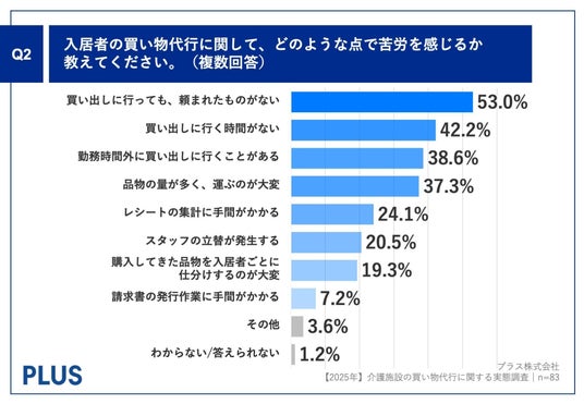 Q1で「かなりある」「少しある」と回答した方に、「Q2.入居者の買い物代行に関して、どのような点で苦労を感じるか教えてください。(複数回答)」(n=83)と質問したところ、「買い出しに行っても、頼まれたものがない」が53.0%、「買い出しに行く時間がない」が42.2%、「勤務時間外に買い出しに行くことがある」が38.6%という回答となりました。