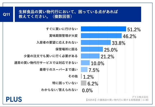 Q10で「頻繁にある」「時々ある」「たまにある」と回答した方に、「Q11.生鮮食品の買い物代行において、困っている点があれば教えてください。(複数回答)」(n=80)と質問したところ、「すぐに買いに行けない」が51.2%、「賞味期限管理が大変」が46.2%、「入居者の要望に応えきれない」が33.8%という回答となりました。