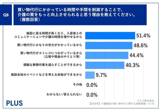 Q7で「とてもそう思う」「ややそう思う」と回答した方に、「Q8.買い物代行にかかっている時間や手間を削減することで、介護の質をもっと向上させられると思う理由を教えてください。(複数回答)」(n=72)と質問したところ、「施設に居る時間が長くなり、入居者とのコミュニケーションや介護の時間を増やせるから」が51.4%、「買い物代行にかなりの労力がかかっているから」が48.6%、「買い物代行がストレスにつながっているから(立替や現金のやりとり等)」が44.4%という回答となりました。