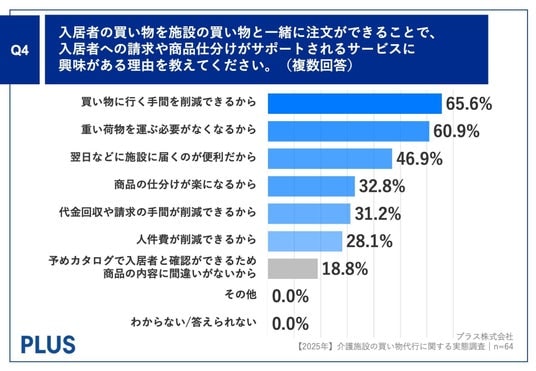 Q3で「とても興味がある」「やや興味がある」と回答した方に、「Q4.入居者の買い物を施設の買い物と一緒に注文ができることで、入居者への請求や商品仕分けがサポートされるサービスに興味がある理由を教えてください。(複数回答)」(n=64)と質問したところ、「買い物に行く手間を削減できるから」が65.6%、「重い荷物を運ぶ必要がなくなるから」が60.9%、「翌日などに施設に届くのが便利だから」が46.9%という回答となりました。