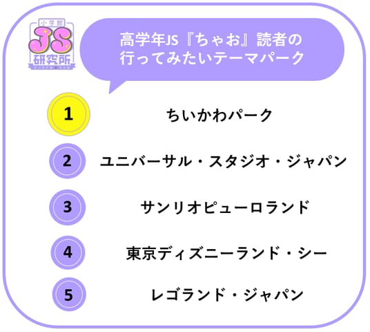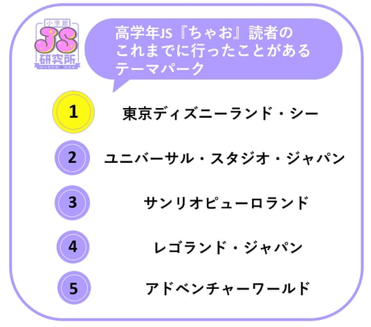 『ちゃお』2025年9月号アンケートで「これまでに行ったことがあるテーマパーク」について尋ねたところ、1位「東京ディズニーランド・シー(R)」、2位「ユニバーサル・スタジオ・ジャパン」、3位「サンリオピューロランド」という結果に。