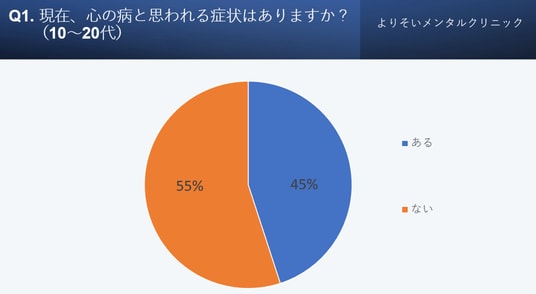 その結果、10~20代の社会人のうち約45%が心の病の症状を実感しており、年代が上がるごとに割合は少なくなる傾向にあると分かりました。