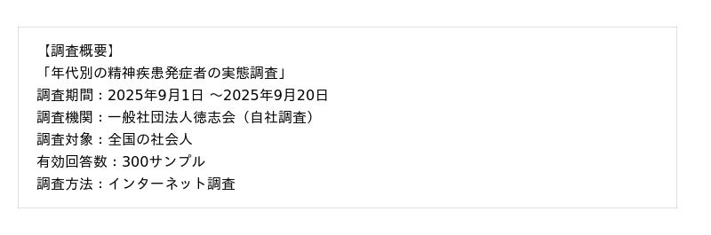 一般社団法人徳志会は、全国の社会人を対象に年代別の精神疾患の実態に関するアンケート調査を実施しました。