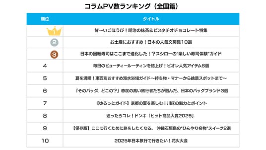 今回の調査では、スイーツや美容、夏のレジャーといったテーマが特に多くの関心を集めていることがわかりました。なかでも1位となった「明治 抹茶&ピスタチオチョコレート特集」は、定番の“抹茶”に加え、近年注目度が高まっている“ピスタチオ”がテーマである点が特徴的です。特に2022年にSNSで拡散されたピスタチオ関連の動画をきっかけに“ピスタチオブーム”が続いており、その関心の高さが訪日外国人の閲覧行動にも表れていると考えられます。以下は、2025年8月に最も読まれたコラムTop10です。