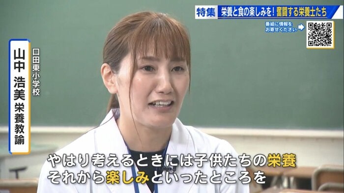 口田東小学校の栄養教諭・山中浩美さんは「うまみの少ない汁物は野菜をしっかり炒めて甘みを引き出します。鰹節を強く煮出してだしの味を濃くするなど、『おいしさ』が変わらないように工夫しています」と語る。