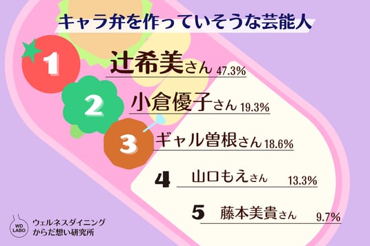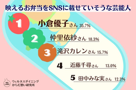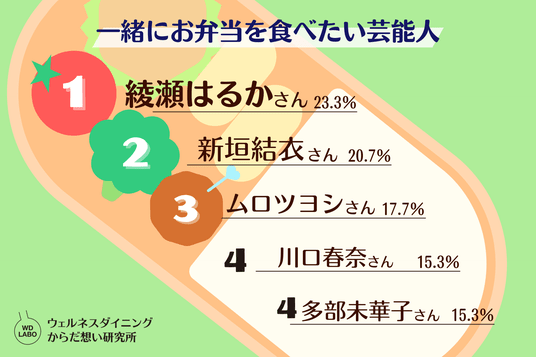 ウェルネスダイニング株式会社(本社:東京都墨田区、代表取締役:中本 哲宏)は、全国の20~50代の男女300名を対象に「お弁当にまつわる芸能人イメージ調査」を実施しました。調査では、「手作りしていそう」「SNSに映え弁当を載せていそう」「キャラ弁が得意そう」「一緒に食べたい」「ロケ弁に詳しそう」という5つのテーマごとにランキング化。