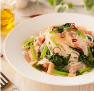 ほうれん草とベーコンの旨味、オリーブオイルとにんにくの香りをライスパスタが引き立てるシンプルなメニューです。もっちり食感とお米の香りが楽しめるライスパスタで、具材とオリーブオイルの美味しさを引き立てる味付けに仕上げました。