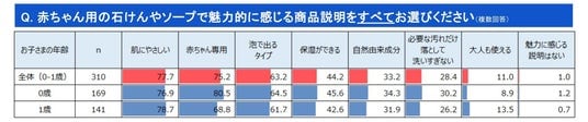 0歳~1歳用の石鹸・ソープで魅力に感じる商品説明をすべてお選びください、という問いの回答では77.7%の方が「肌にやさしい」を選択しました。次にシェアの多い「赤ちゃん専用」は、0歳と1歳で11.7ptの差があり、お子さまの年齢や月齢が若いほど魅力的と感じていそうです。
