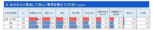 また、父親*に担当してほしい育児のトップシェアも「お風呂に入れる」という結果でした。