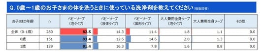 また、0歳~1歳のお子さまの体を洗うときにお風呂などで使っている洗浄剤を教えてください、という問いには、全体の82.5%の方が泡タイプのベビーソープを使用している、と回答しました。次に回答数が多い液体タイプのベビーソープとの差は68.2ptと、泡タイプのベビーソープの利用者が圧倒的に多い結果でした。