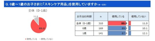 回答者全体で0歳~1歳のお子さまにスキンケアをしている方は89%の結果でした。0歳と1歳では、ほぼ同じ結果です。