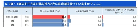 0歳~1歳のお子さまの体を洗うときに、お風呂などで洗浄剤を使っていますかという問いには、全体の90.3%の方が石けんやソープを使っている、と回答しました。沐浴剤(石けんなしで赤ちゃんを清潔に保つための専用入浴剤)のみを使用している方は全体の7.4%で、1歳のお子さまを持つ方の中でも利用者がいました。