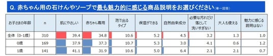 また、最も魅力を感じる説明を単一回答で選択する問いの結果を見ても、「肌にやさしい」「赤ちゃん専用」「泡で出るタイプ」がTOP3である点は変わりませんでした。