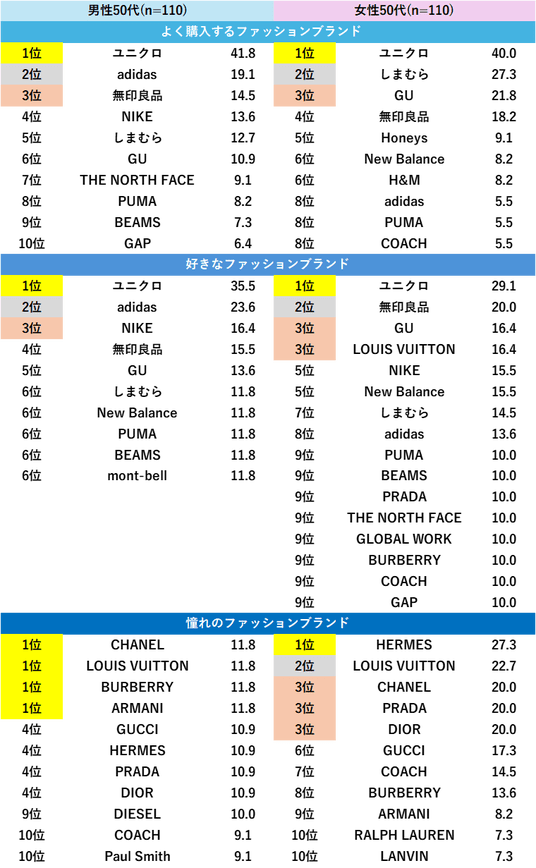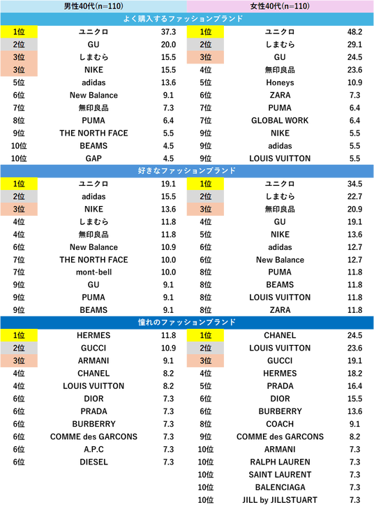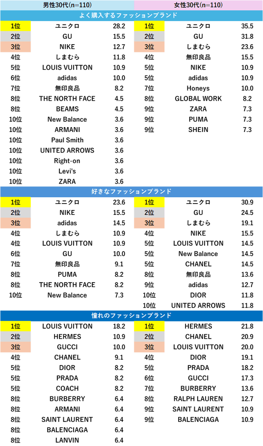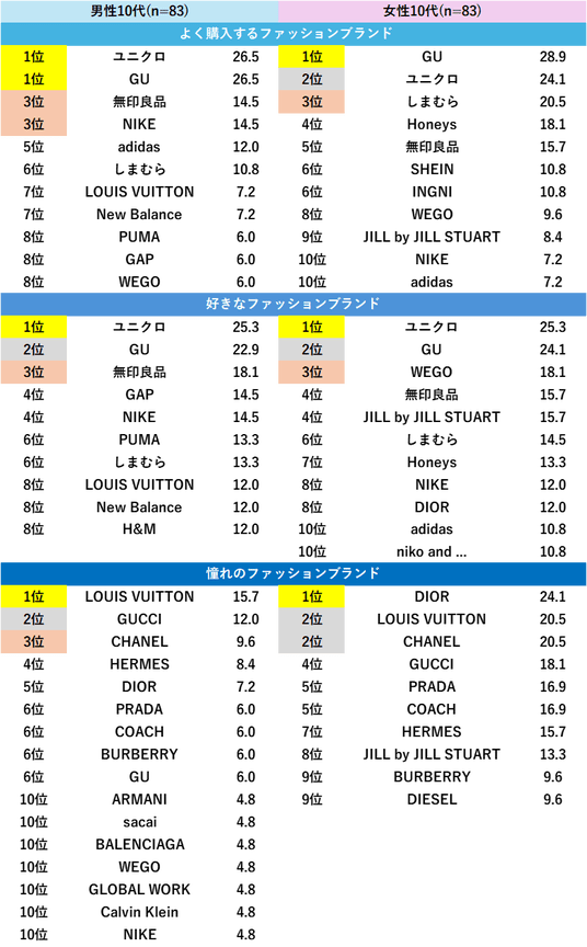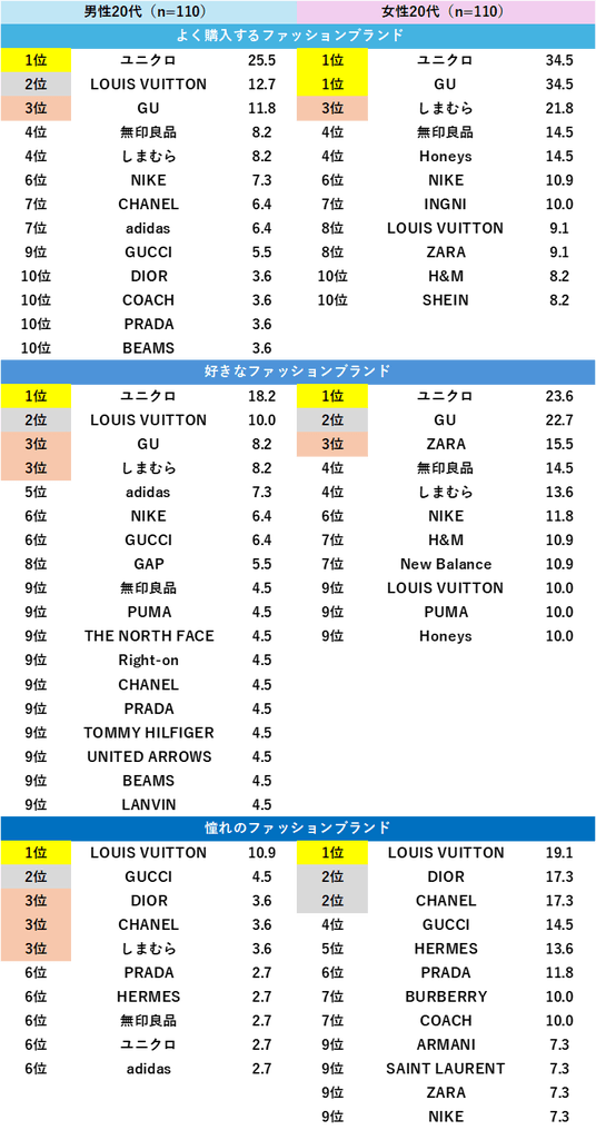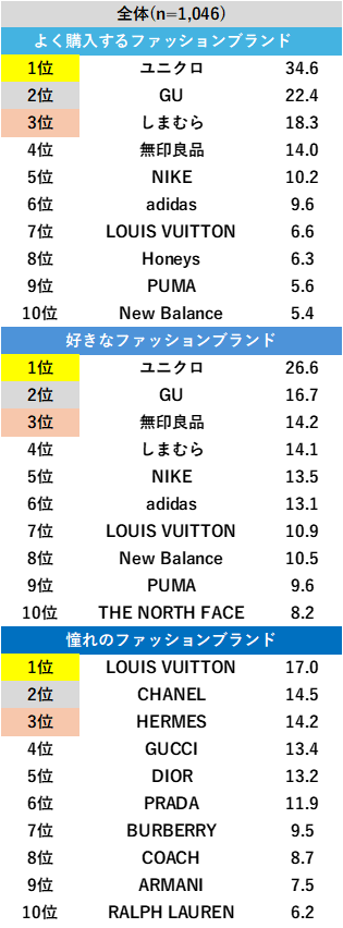 一方、「憧れのファッションブランド」ではハイブランドの名が並び、現実的な購買ブランドと理想のブランドのギャップがうかがえる結果となった。