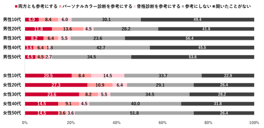 中でも女性10~20代の関心が高く、「両方とも参考にする」「パーソナルカラー診断を参考にする」「骨格診断を参考にする」を合わせると、どちらの年代も4割を超えた。女性10代は「骨格診断」(14.5%)、女性20代は「両方とも」(27.3%)が、他の性年代よりも高かった。ファッションを感覚ではなく“論理的に選ぶ”志向がうかがえる。