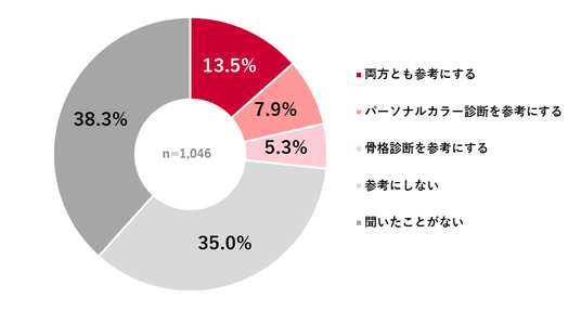 近年話題となっている「パーソナルカラー診断」や「骨格診断」について、自身の服選びに活用しているかを尋ねたところ、「両方とも参考にする」が全体の13.5%、「パーソナルカラー診断を参考にする」が7.9%、「骨格診断を参考にする」が5.3%となった。