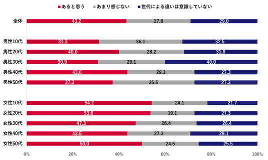 性年代別で見ると、女性は全ての年代で「あると思う」が4割を超え、男性よりも高い傾向だった。割合が最も高いのは女性10代(54.2%)、次いで女性20代(53.6%)で、それぞれ過半数を占めた。
