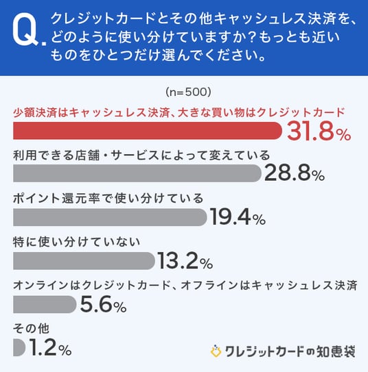 そこで今回は事前調査で「クレジットカードとその他のキャッシュレス決済どちらも利用している」と回答した全国の男女500名を対象に「クレジットカードとその他キャッシュレス決済の使い分け」についてのアンケートをおこないました。