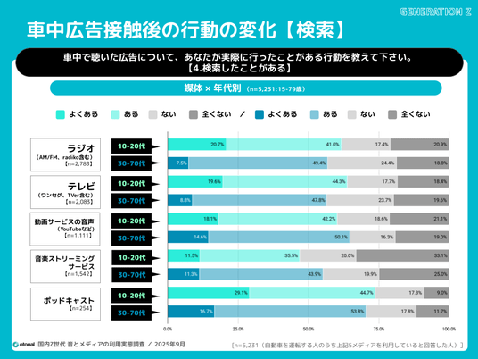 車中でポッドキャスト広告接触後の検索経験の割合は、若年層で7割に
