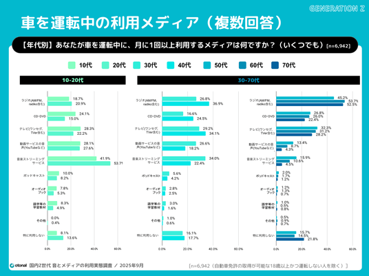 若年層の運転中の利用メディアは音楽ストリーミング。40代以上はラジオが最も多い