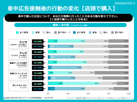 車中でポッドキャスト広告に接触した若年層の店頭購入経験は6割超