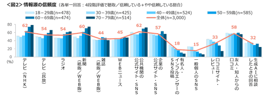 13の情報源を呈示し4段階で信頼度合いを聴取した。信頼している+やや信頼している割合は、「公共機関の公式サイト・SNS」「テレビ(NHK)」が62%、「新聞(紙版/WEB版)」で60%と信頼度が高く、いずれも年代が上がるほど割合は高い。一方、信頼度が低いのは「一般個人のSNS」と「有名人・インフルエンサーのSNS投稿」で2割に満たないものの、「口コミサイト・レビュー」も加え、若い世代ほど信頼度が高まる傾向が顕著であった。<図2>