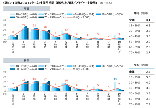 直近1か月間のプライベートで使うインターネット利用時間は、平日3.1時間、休日3.8時間で若い世代ほど利用時間は長い。ボリュームゾーンは平日・休日ともに1~3時間。18~29歳のボリュームゾーンは、平日5時間、休日10時間以上であり、他年代に比べ利用時間の長さが際立っている。<図5>